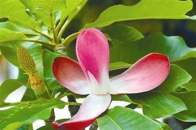 厚朴不仅全身都是宝,厚朴树也深受人们喜爱。厚朴的种子可榨油,含油量35%,出油率25%。厚朴木材供建筑、板料、家具、雕刻、乐器、细木工等用。厚朴为典型的落叶乔木,树体高大,树身通直,冠形美观,冠盖如云,浓荫铺地,叶大而绿、似芭蕉,叶片近革质,7-9片聚生于枝端,长圆状倒卵形。花生于枝端,花色白紫艳丽,芳香浓郁,花径10-15厘米,花被片多达9-12片,淡绿色或浮白色,花盛开时花瓣外转,朵朵如莲,花丝红色,单株花期长20多天,林分花期长2月余,是优良的园林观赏树种。