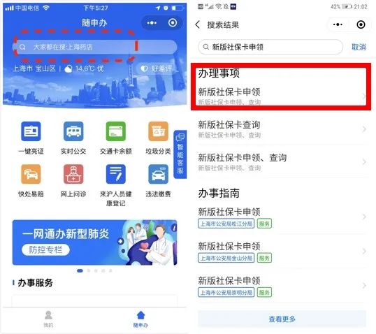 将微信对话框界面下滑,搜索“随申办”小程序。进入小程序后,搜索“新版社保卡” ,点击“办理事项”里的“新版社保卡申领”。