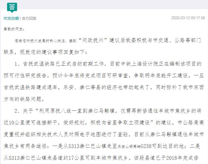 4.至于争取立项南昌-崇仁-宜黄(乐安)-宁都-瑞金铁路问题,目前我市正在争取将南丰至瑞金铁路列入国家新时代中长期铁路网规划和国家铁路建设“十四五”规划,这样有了吉抚武温铁路和南丰至瑞金铁路两条铁路就自然解决了网友所考虑的问题。