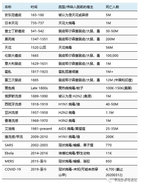 下表中展示了历史上历次出现瘟疫的时间、类型和死亡人数。