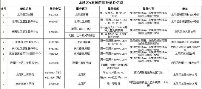 龙凤区共有预防接种门诊9家,狂犬病暴露预防处置门诊1家、出生医院接种室1家,其他具体要求,也可咨询龙凤区疾控中心免疫规划科,电话:6750233。