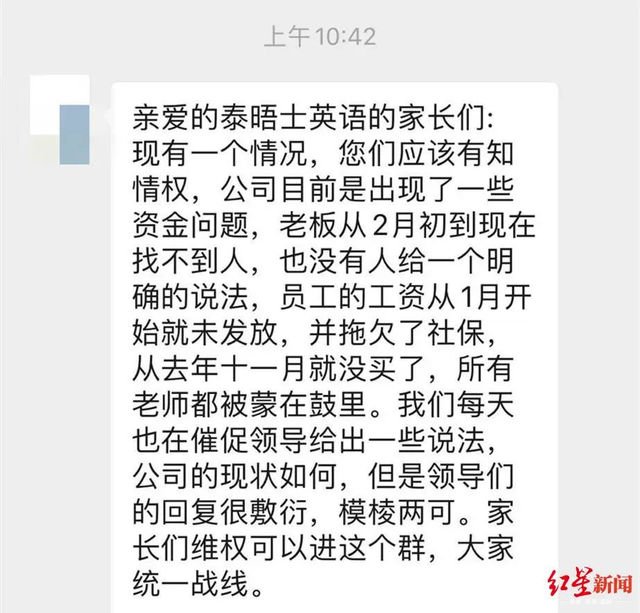3月18日上午10点过,在成都生活的朱女士收到泰晤士英语培训机构老师在微信群里发的消息:“亲爱的家长,公司目前是出现了一些资金问题,老板从2月初到现在找不到人,也没有人给一个明确的说法,员工的工资从1月开始就未发放,并拖欠了社保,所有老师都被蒙在鼓里了。”