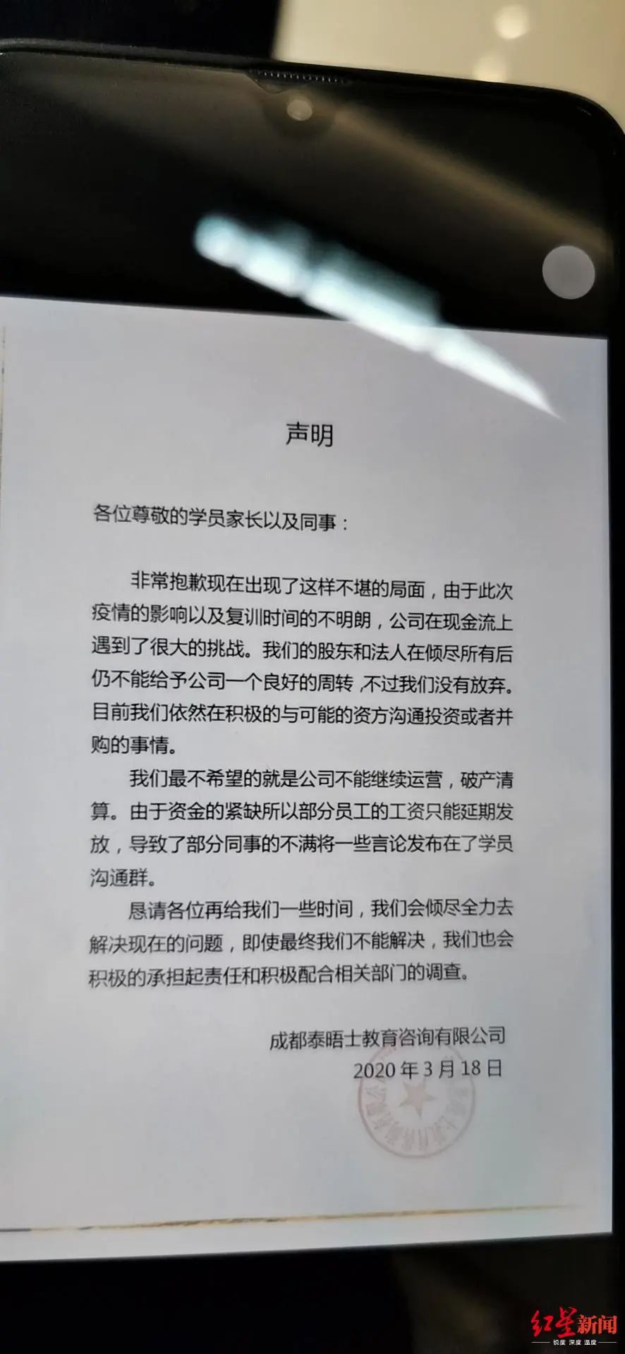 此外,网上微信群还流传了一份声明,盖有泰晤士英语的章,声明中称,由于疫情影响和复训时间不明朗,公司现金流遇到很大挑战。目前依然在积极和与可能的资方沟通投资或并购的事情。不过,该声明还不能确认是公司发出的。