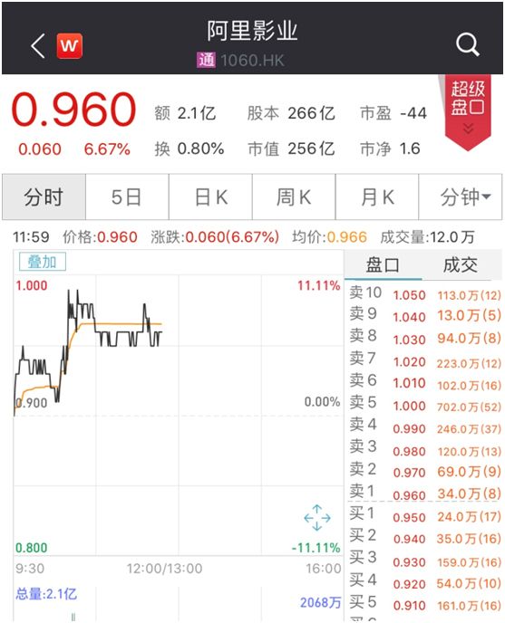 3月19日,港股三大指数悉数大跌,截至午间收盘,恒指半日跌4.25%。但是,阿里影业受上述消息提振逆势上涨,盘中一度涨至11.11%,截至发稿,阿里影业报0.96港元,涨6.67%,市值上涨约19亿港元,最新总市值256亿港元。