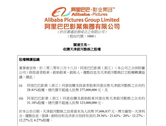 根据协议内容,阿里巴巴影业(浙江)从投资者股东处收购天津银河酷娱共约28.81%股权,总代价不超过人民币2.77亿元;并从创始股东处收购天津银河酷娱共约31.18%股权,总代价不超过人民币1.23亿元。