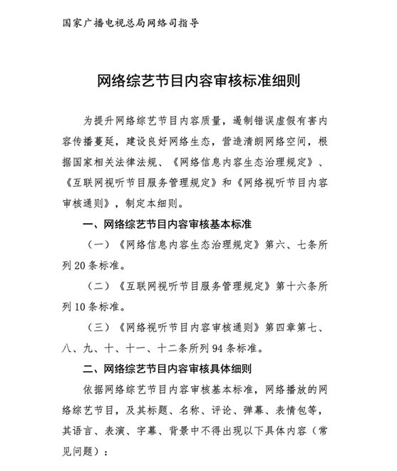 2月21日,按照国家广播电视总局工作部署,在总局网络视听节目管理司指导下,中国网络视听节目服务协会联合央视网、芒果TV、腾讯视频、优酷、爱奇艺、搜狐、哔哩哔哩、西瓜视频、快手、秒拍等视听节目网站制订了《网络综艺节目内容审核标准细则》。