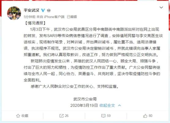 1月3日下午,武汉市公安局武昌区分局中南路街中南路派出所对在网上出现的转发、发布SARS等传染病信息情况进行了调查,安排值班民警与李文亮医生谈话核实,现场制作笔录,对其训诫,并出具训诫书,属处置不当、适用法律错误、执法程序不规范。武汉市公安局决定撤销训诫书,并就此错误向当事人家属郑重道歉。我们将认真吸取教训,改进工作,努力做到严格规范公正文明执法。