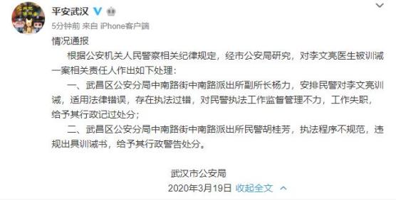 据平安武汉微博消息,根据公安机关人民警察相关纪律规定,经市公安局研究,对李文亮医生被训诫一案相关责任人作出如下处理: