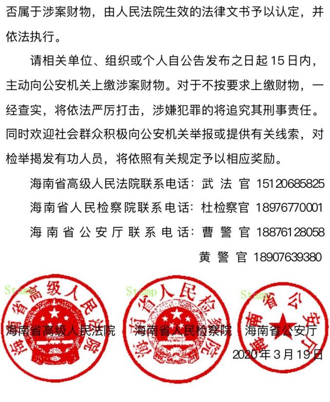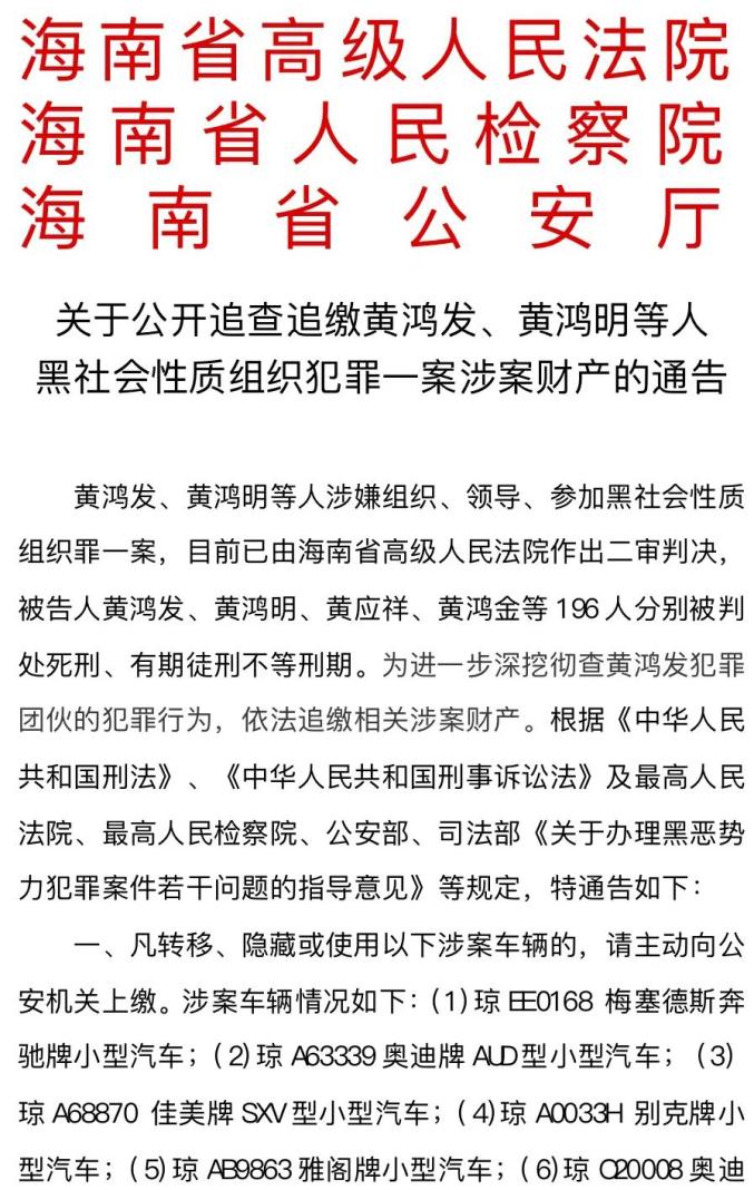 黄鸿发、黄鸿明等人涉嫌组织、领导、参加黑社会性质组织罪一案,目前已由海南省高级人民法院作出二审判决,被告人黄鸿发、黄鸿明、黄应祥、黄鸿金等196人分别被判处死刑、有期徒刑不等刑期。为进一步深挖彻查黄鸿发犯罪团伙的犯罪行为,依法追缴相关涉案财产。根据《中华人民共和国刑法》、《中华人民共和国刑事诉讼法》及最高人民法院、最高人民检察院、公安部、司法部《关于办理黑恶势力犯罪案件若干问题的指导意见》等规定,特通告如下: