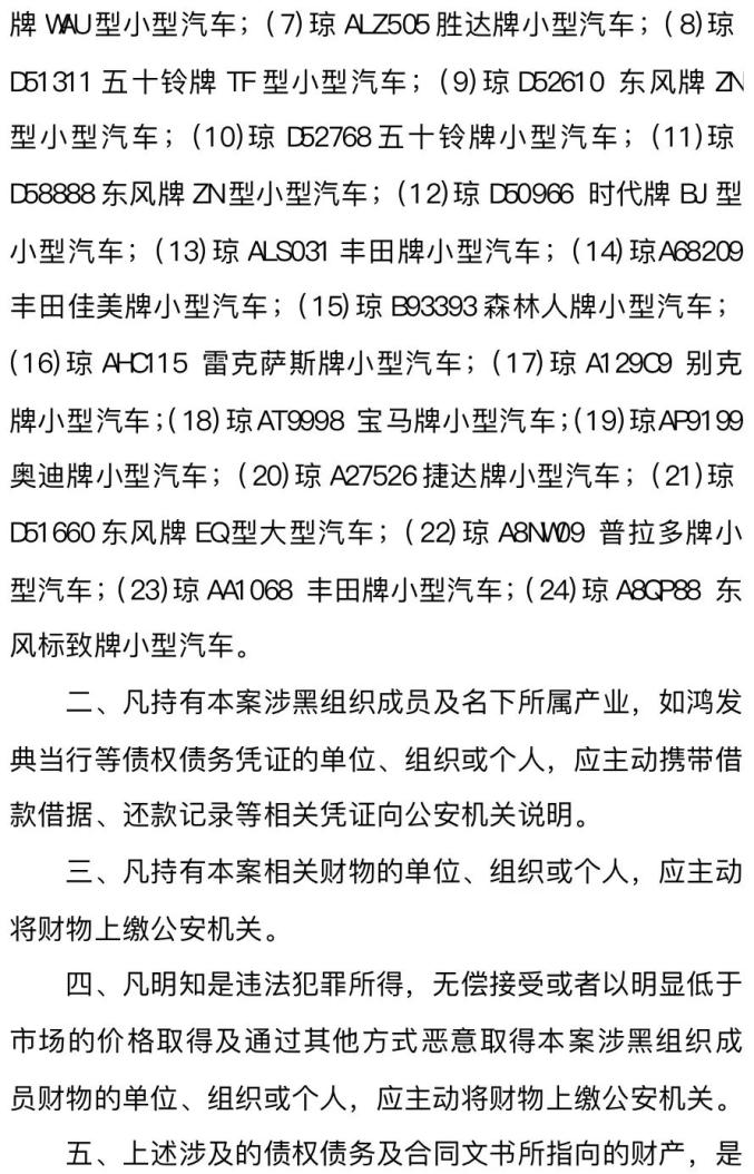 二、凡持有本案涉黑组织成员及名下所属产业,如鸿发典当行等债权债务凭证的单位、组织或个人,应主动携带借款借据、还款记录等相关凭证向公安机关说明。
