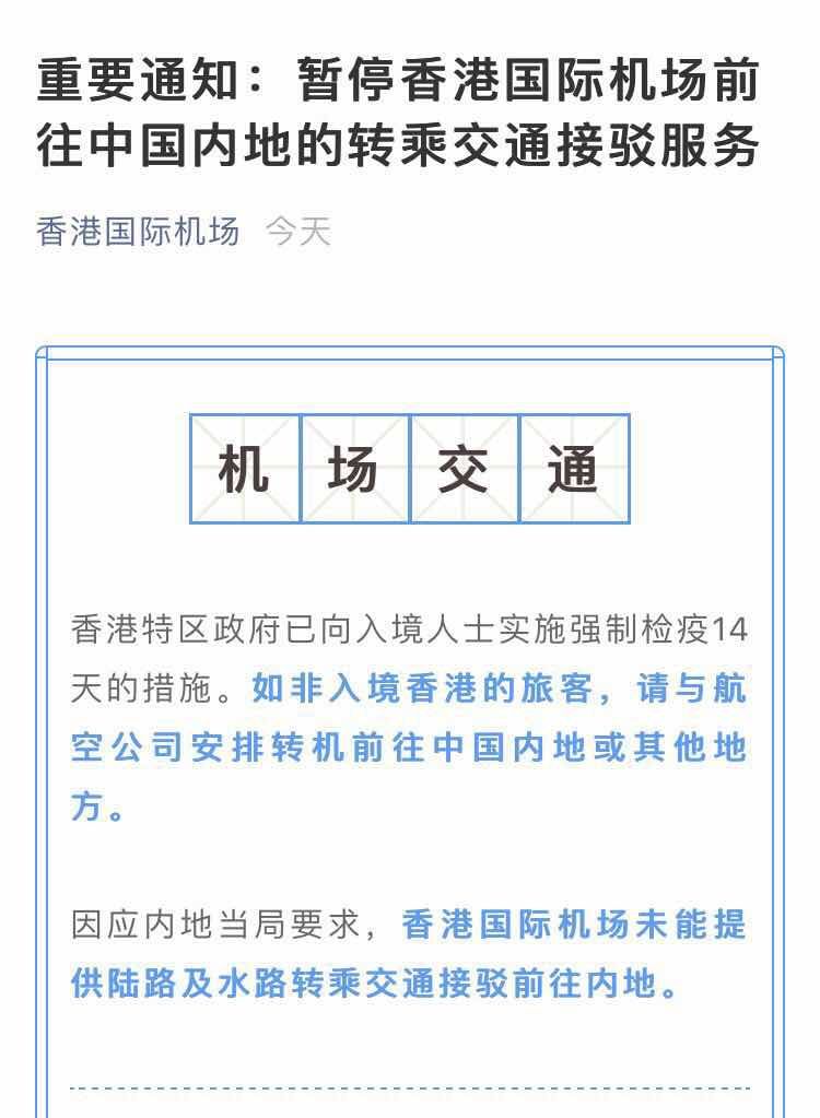 据“香港国际机场”微信公众号消息,香港特区政府已向入境人士实施强制检疫14天的措施。如非入境香港的旅客,请与航空公司安排转机前往中国内地或其他地方。