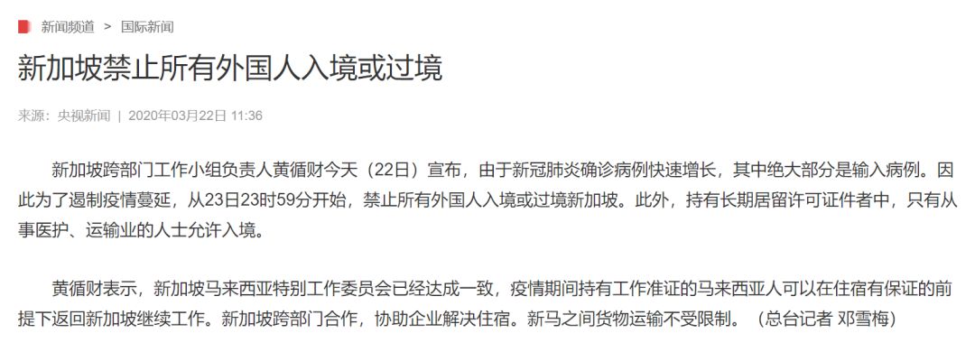 据央视网报道,3月22日,新加坡跨部门工作小组负责人宣布,为遏制疫情蔓延,从23日23时59分开始,禁止所有外国人入境或过境新加坡。同时,持有长期居留许可证件者中,也只有从事医护、运输业的人士允许入境。