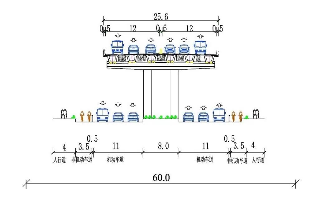 S4公路高架主线车道规模为双向6车道,机动车专用,设计车速为80公里/小时;地面辅道:机动车双向6车道,两侧设置非机动车道及人行道,设计车速为40公里/小时。