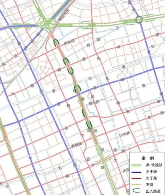 S4公路高架主线为高速公路入城段,服务长距离交通;地面辅道为城市次干路,服务闵行南部地区到发交通。