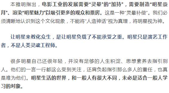 这虽然不是完全没道理,粉丝会在一定程度上受明星的影响,但都高估了明星对粉丝的影响力。我们要做的,恰恰是不应该过于强调明星在思想上去引领粉丝,因为这另一面就是赞成粉丝将明星视为精神领袖、人生导师。