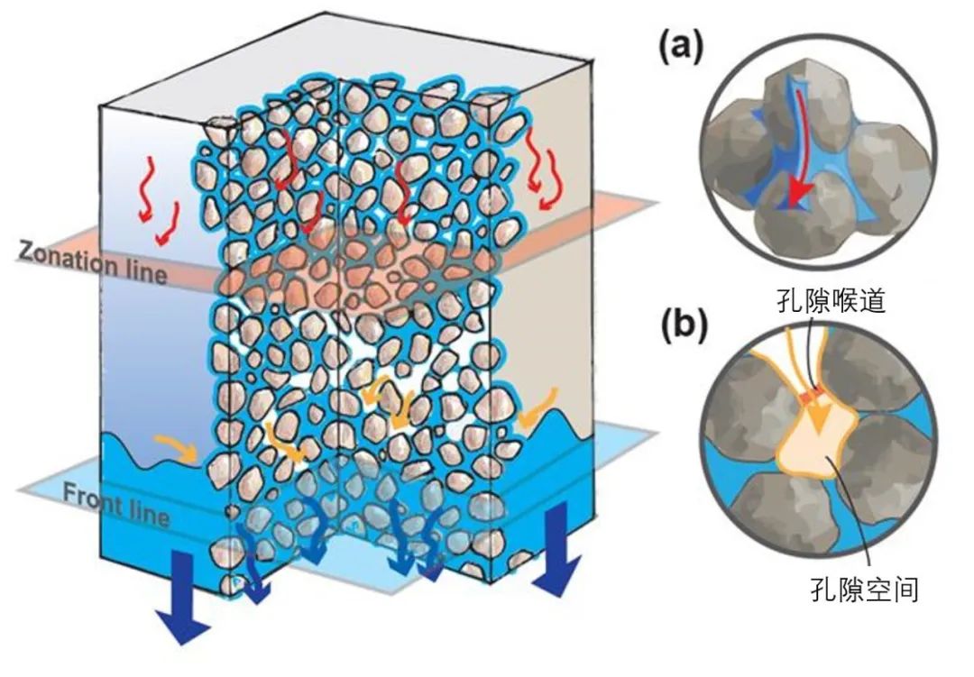 油气和地下水等流体,便分布在岩石颗粒之间的孔隙里,连接孔隙空间的狭窄通道被称作孔隙喉道(简称孔喉,如下图b)则限制着流体在地下的流动[2]。当孔喉直径较大时,流体的运动通畅,反之则受阻。