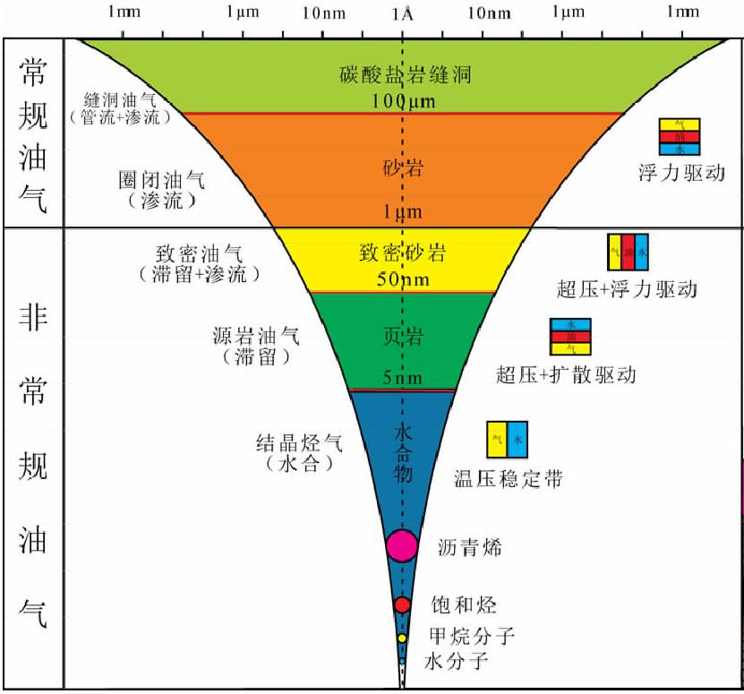 常规油气储存在孔喉直径较大(微米级,μm)的岩石内,易于流动,传统技术即可开发。页岩油气和致密油气储存在孔喉直径较小(纳米级,nm,1μm=1000nm)的岩石内,不易流动,传统技术难以有效开采[9]。而不同尺寸的孔喉背后,对应着一系列地质学细节差异,例如储存岩石类型不同、储存位置不同、储存面积不同等。