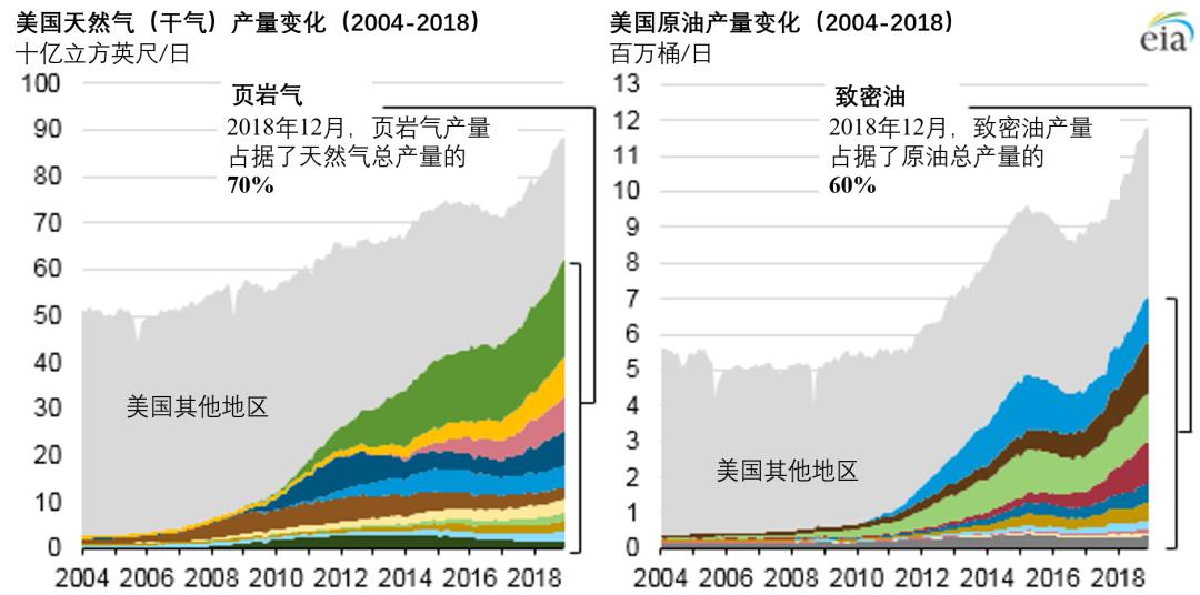 在具体的能源构成上,页岩气和致密油所占比重更是以惊人速度膨胀。至2018年时,致密油和页岩油占据全美石油产量的60%,致密气和页岩气占据全美天然气产量的70%。昔日不起眼的吴下阿蒙,今日已成国之栋梁,不可同日而语也。