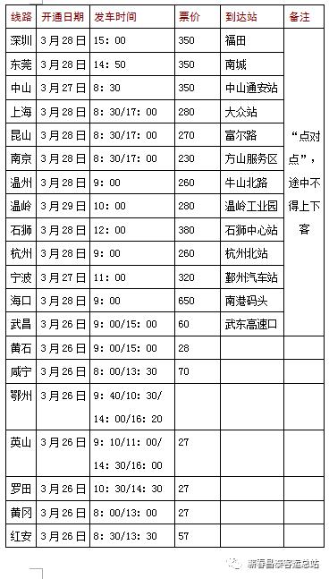 我站将于3月26日起恢复黄石、咸宁、鄂州、黄州、英山、罗田、红安等县、市际班线;开通到广东、上海、温州、温岭、杭州、宁波、海口、石狮以及蕲春到武汉“点对点,一站式”(武东高速路口)客运班线。需要出行的旅客朋友可以根据公布班线时间按照“温馨提示”安排好自己的出行方式。