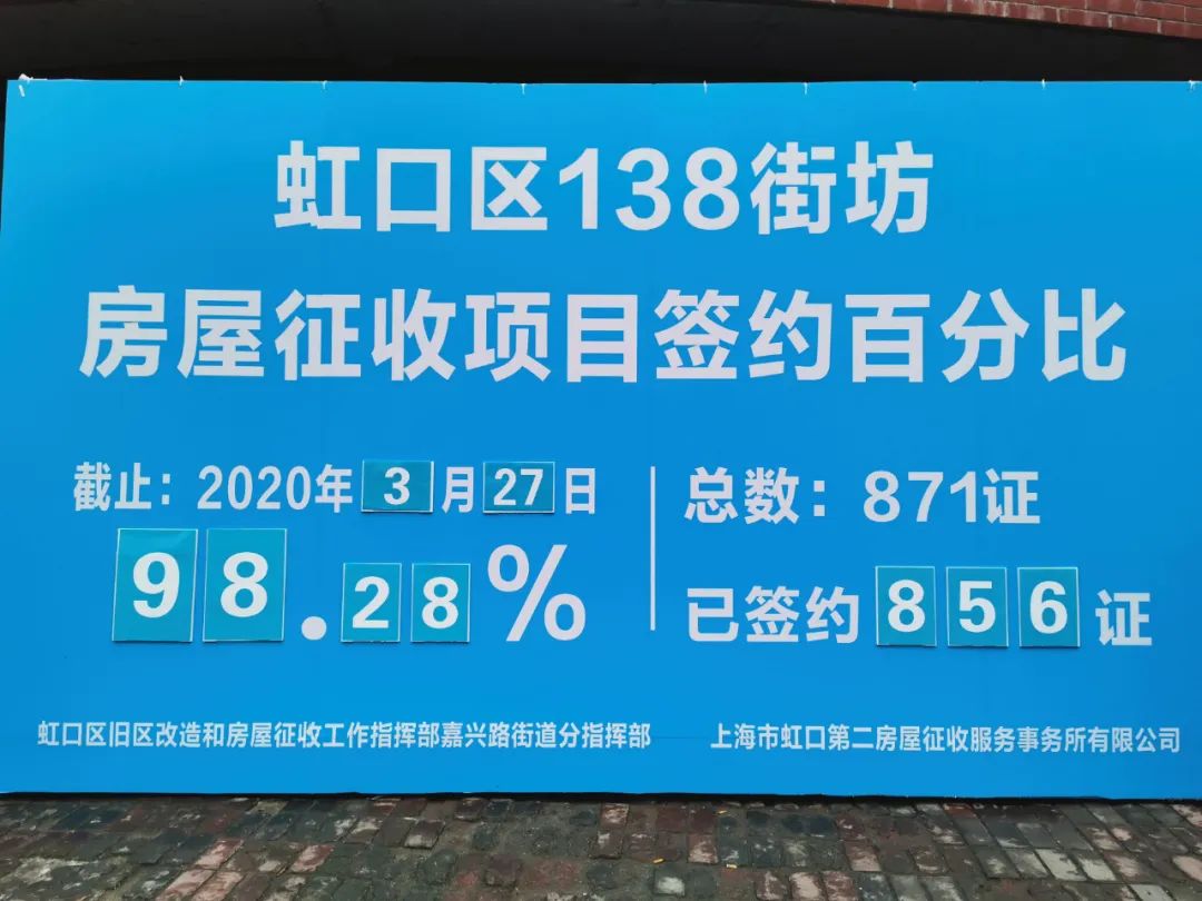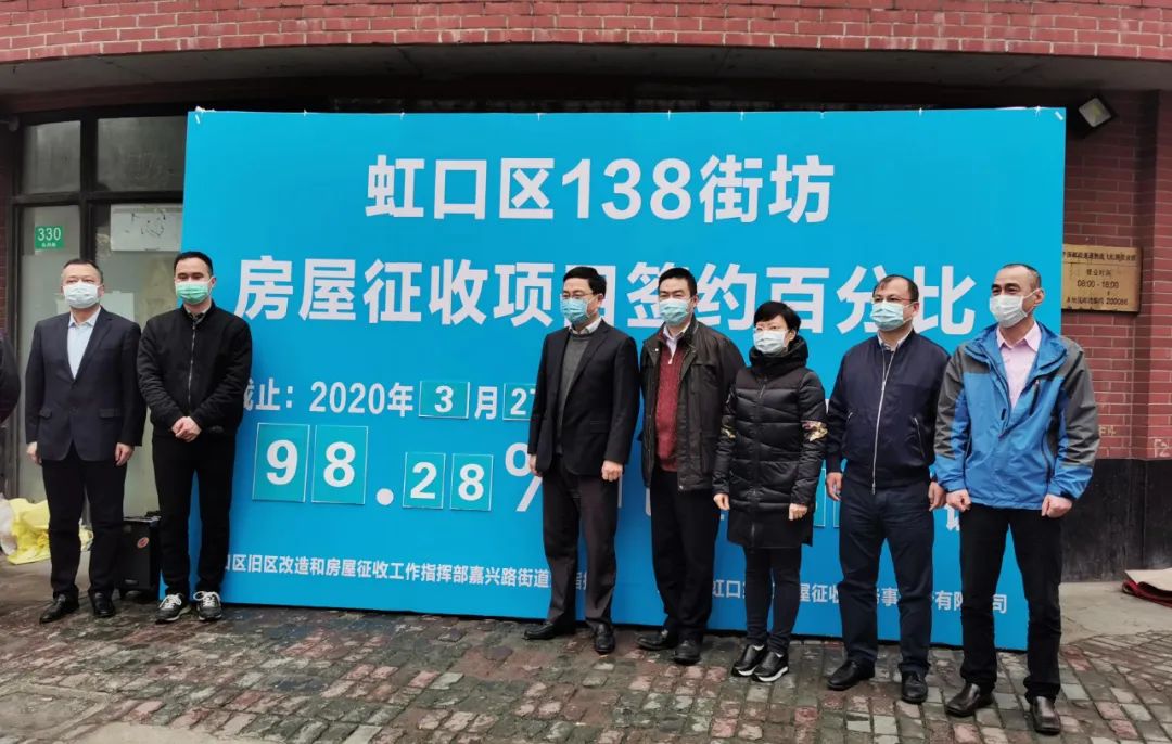 今天上午8点58分,虹口区138街坊房屋征收签约比例达标生效揭牌仪式举行,首日正式签约率达到98.28%,至此,该地块成为今年全市首个复工复产后生效的地块。副区长周嵘宣布成功生效并揭牌。