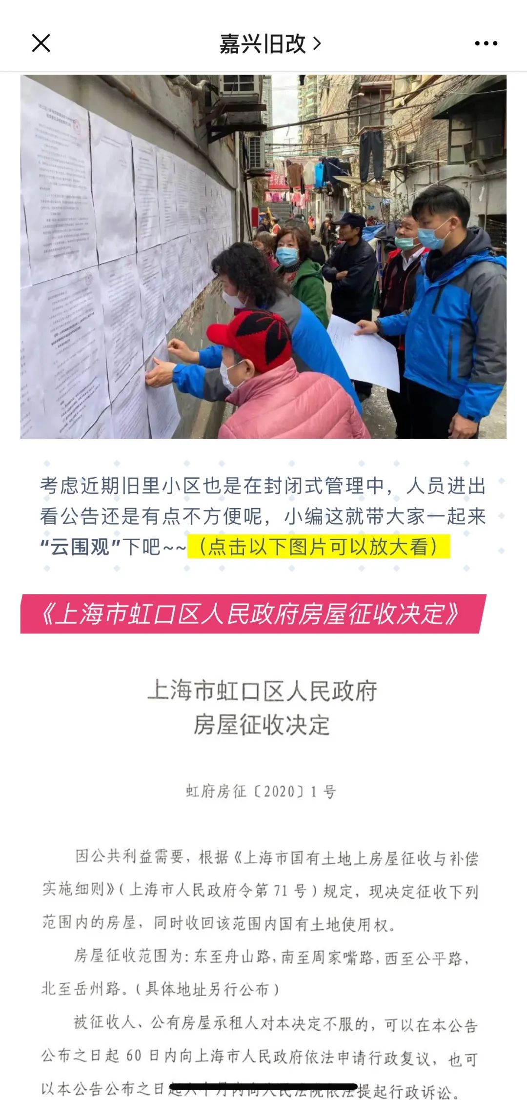 通过微信公众号“上海虹口”“嘉兴旧改”,第一时间发布《上海市虹口区人民政府房屋征收决定》和《虹口区138街坊房屋征收与补偿方案》相关政策。