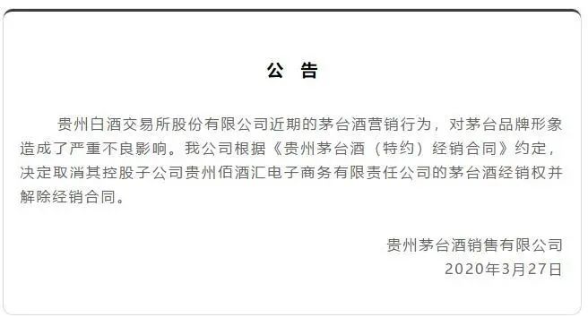 贵州茅台刚刚发出公告,贵州白酒交易所股份有限公司近期的茅台酒营销行为,对茅台品牌形象造成了严重不良影响。根据《贵州茅台酒(特约)经销合同》约定,决定取消其控股子公司贵州佰酒汇电子商务有限责任公司的茅台酒经销权并解除经销合同。