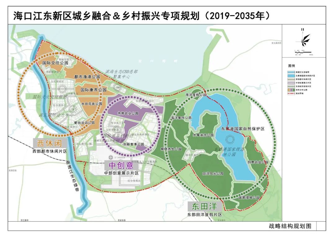 专项规划显示,“一江”为南渡江生态绿带,“一区”为东寨港国家自然保护区,并强化南渡江、东寨港的生态保护,建设江东新区城乡融合的生态文明架构。“三片”为西部都市休闲片区、中部创意展示片区、东部田洋度假片区。“十四园”为14处乡村主题公园园。“十四园”的打造将根据江东新区总体规划确定的城市组团功能,结合道路、水系等特点确定其主题,并强调园园之间、城园之间的联动发展。