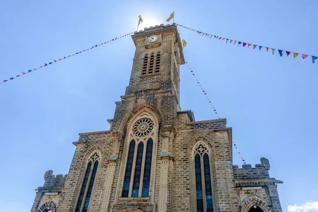 转个弯,走900米,就是另一种画风。建于1928年的芽庄大教堂,是法国殖民时代的印迹。哥特式风格,石造内壁,墙体有雕花,天窗玻璃绘满《圣经》故事,每天早晚都会举行弥撒。