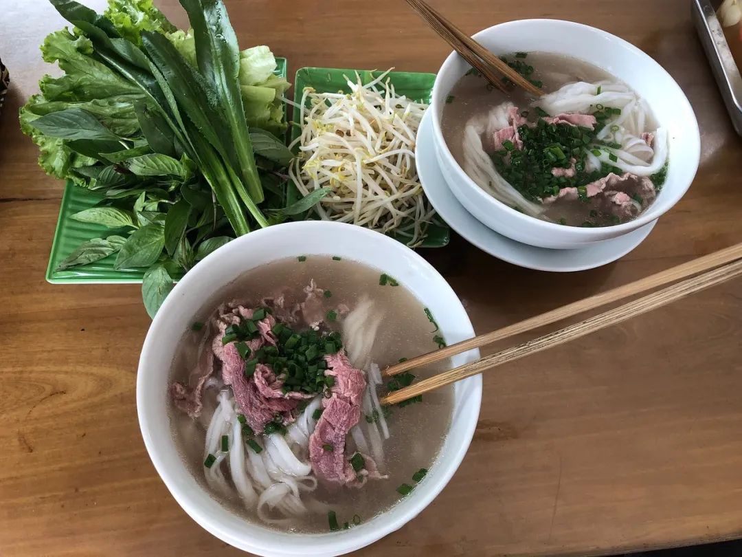 老字号Pho店,只卖两种河粉——大碗生牛肉河粉和小碗生牛肉河粉,配菜分开,自行加入,挤上一点青柠檬汁,汤头更显清甜。