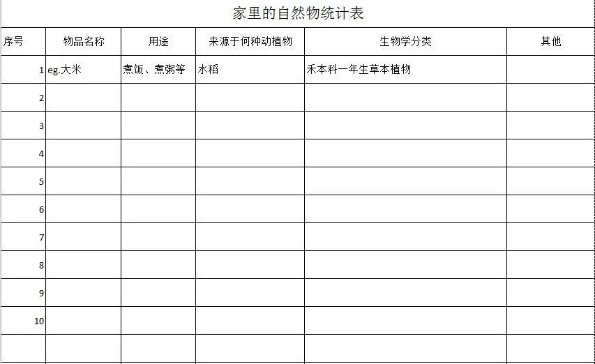 统计每天家里的食材,分析看看这些食材都来自于哪些动植物?把餐桌上的动植物做分类,分类标准可以自行设定,也可以参考绿容君的建议。可参考“”推荐的“家里的自然物统计表”或者自行设计统计表去做统计和分类。
