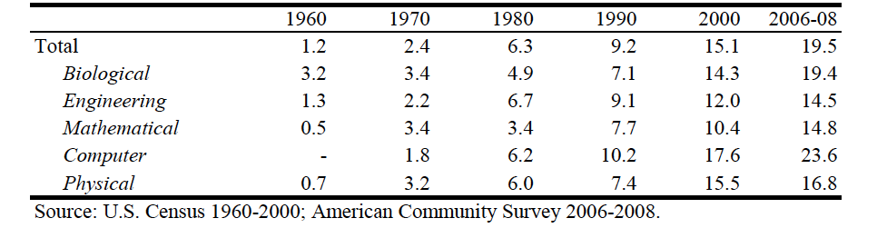 表1. 亚裔在美国科学专业的占比1960-2008 (Xie and Killewald 2012)