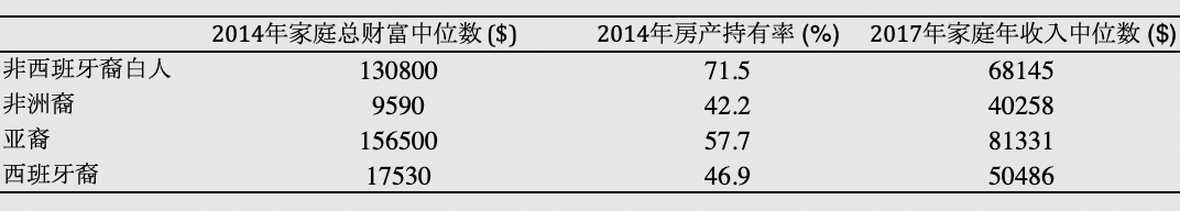 表2.美国家庭财富、收入中位数和房产持有率 (U.S. Census Bureau,2014/2017)