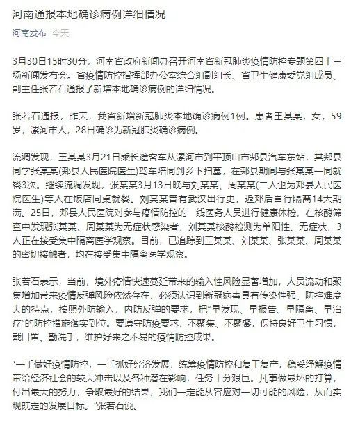 3月30日,河南省政府新闻办召开河南省新冠肺炎疫情防控专题第四十三场新闻发布会。省疫情防控指挥部办公室综合组副组长、省卫生健康委党组成员、副主任张若石通报了新增本地确诊病例的详细情况。