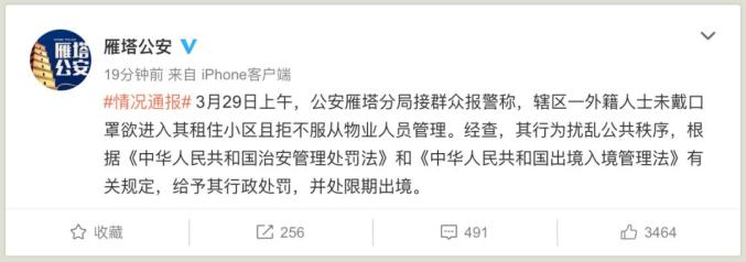 3月29日晚,西安市公安局雁塔分局发布通报,一外籍人士未戴口罩欲进入其租住小区且拒不服从物业人员管理,其行为扰乱公共秩序,给予其行政处罚,并处限期出境。