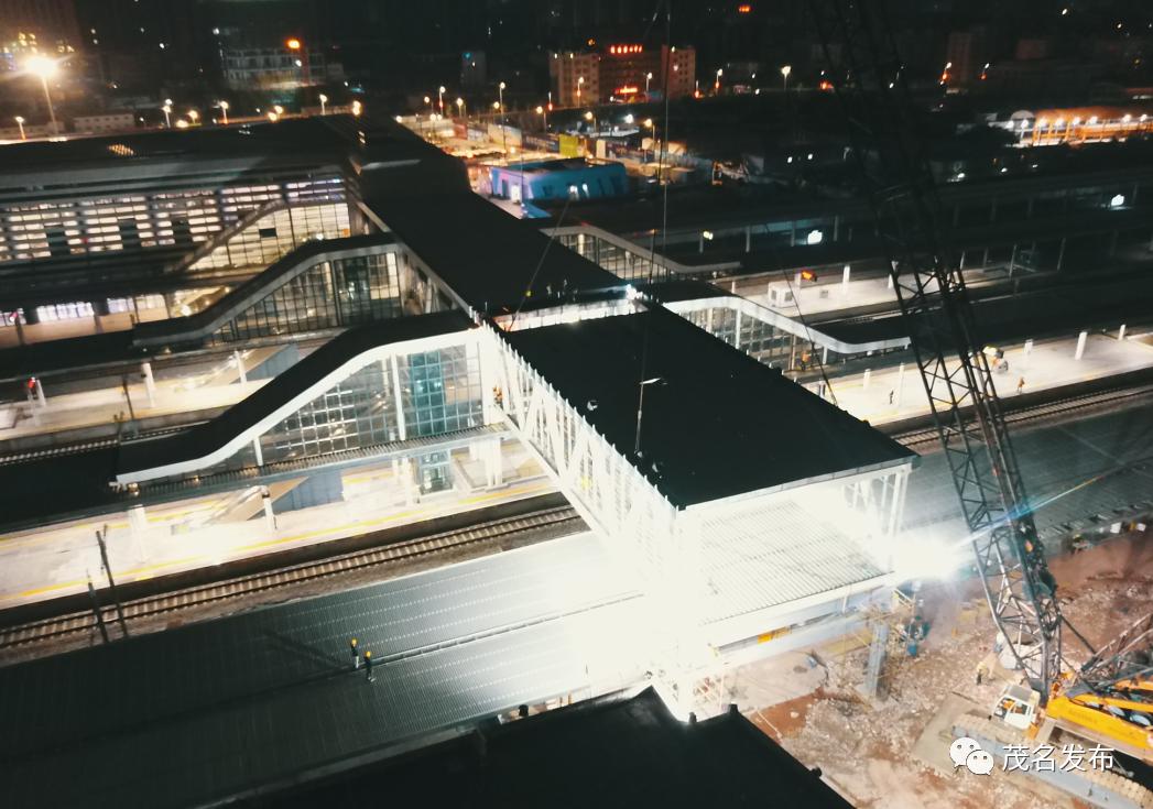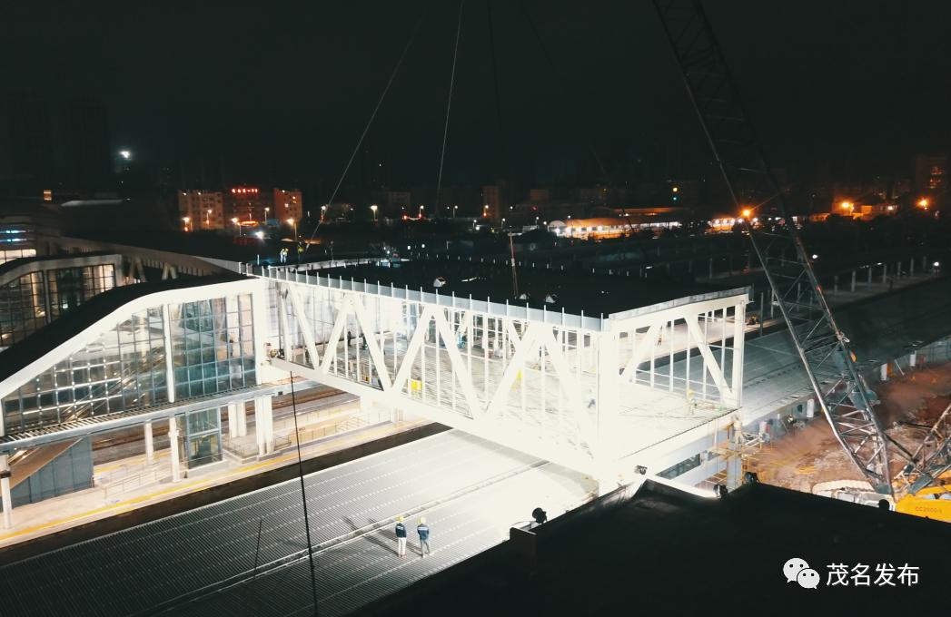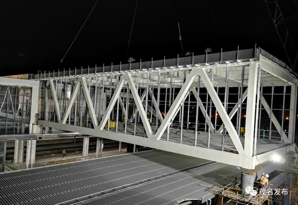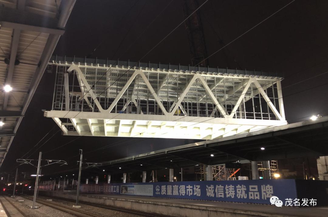原标题:《全线贯通!茂名站进站天桥第三跨钢结构完成吊装》