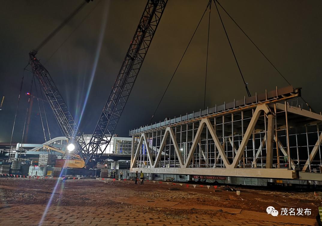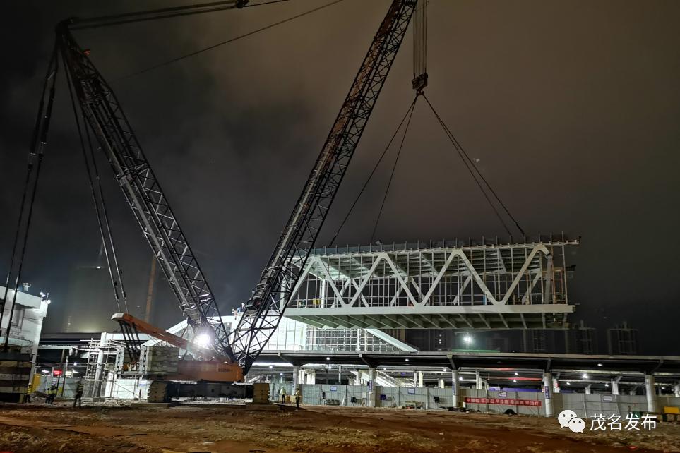 茂名站进站天桥第三跨钢结构顺利吊装。通讯员 王会生 摄中铁建工现场负责人表示,茂名站进站天桥第三跨钢结构顺利吊装完成,标志着中铁建工集团茂名站站房建设在打好新冠肺炎疫情阻击战的重要时期,打赢了生产经营攻坚战的第一仗,取得了工程关键节点的重大胜利,为茂名站北站房按期建成运营奠定了坚实基础。此前,茂名站南站房已于2019年10月21日实现开通运营。
