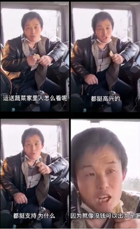 疫情期间,他开着大卡车为武汉送菜,无意间遇到记者。他咬着煎饼,特别质朴地说:「没钱可以出力是吧」。