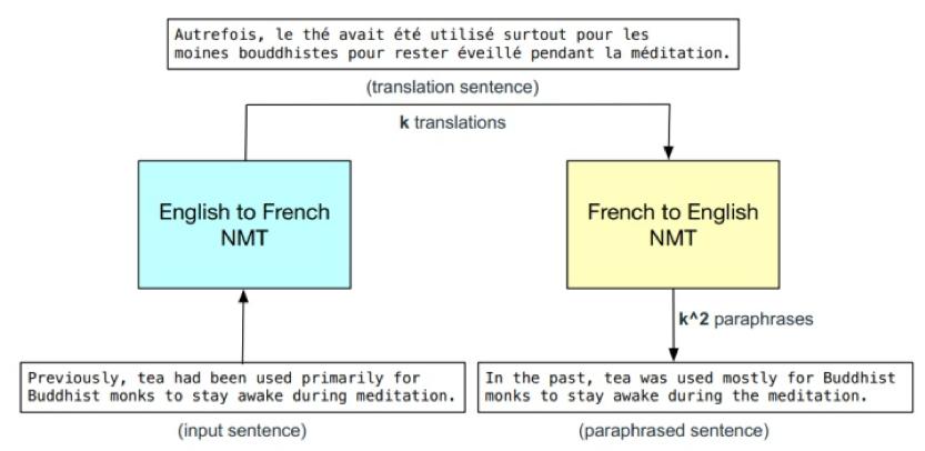 到了 2018 年,CMU 和 google brain 的团队将回译技术独立出来作为一个专门的数据增强技术用来优化问答模型的性能 [10]。他们同时训练了两个 NMT 模型,分别是 English to French 和 French to English,用来实现回译,如下图所示: