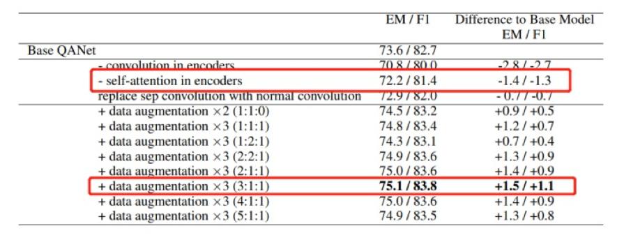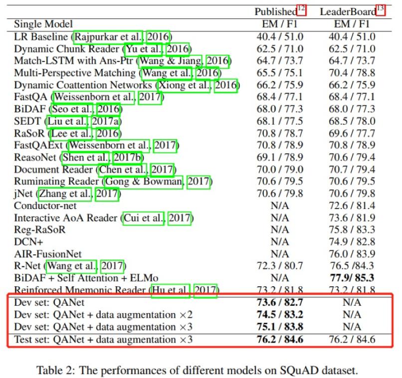 Yu, Adams Wei, et al. "Qanet: Combining local convolution with global self-attention for reading comprehension." arXiv preprint arXiv:1804.09541 (2018).