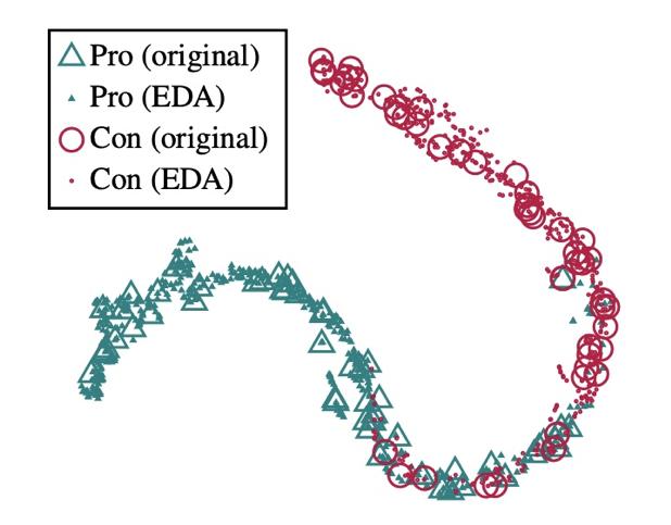 对于这种方法,最大的一个疑问是,经过 EDA 操作之后,文本的类别标签(label)是否还能保持不变,毕竟这是对文本进行随机操作。研究人员对于这个问题专门进行了实验分析。首先,他们仅用原始训练集 (未经过数据增强) 训练了一个分类模型,这里姑且称之为「模型 A」。接下来,利用 EDA 方法对测试集进行了数据拓展。最后,将原有的测试集和拓展出的语料输入到模型 A 中,并对模型在最后线性层的输出进行了比较。他们发现原有测试集和拓展出的语料,在高维空间中,距离很小。二者经过 t-SNE 算法降维之后的结果对比,如下图所示: