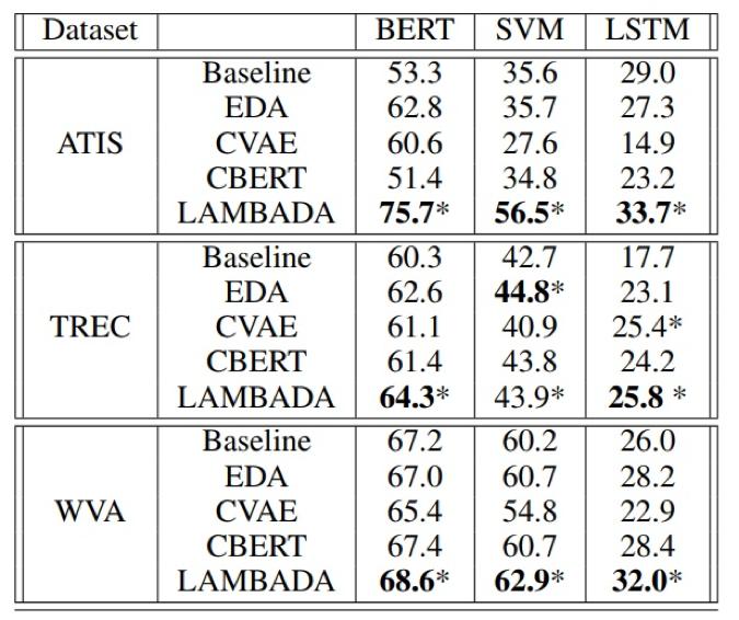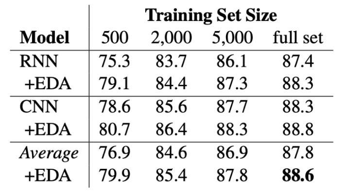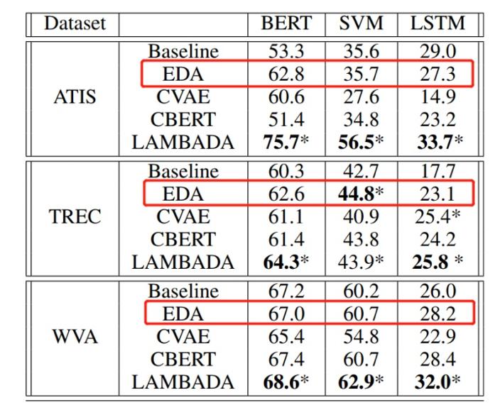 此外,在 19 年 11 月由 IBM 研究团队发表的一项新的文本增强技术的研究中 [2],也对 EDA 技术进行了对照实验: