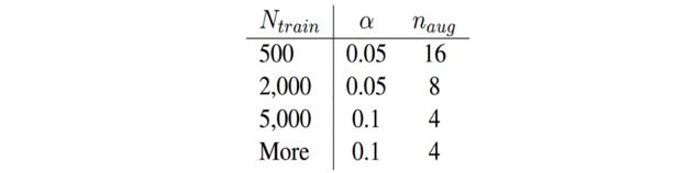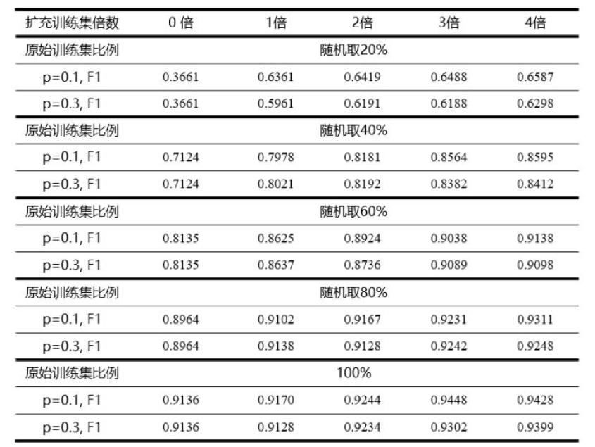 关于 EDA 技术,另一个需要重点关注的问题是,在运用 EDA 技术,如何设置替换比例 和 增强的文本倍数,比如 2000 条语句应对多少数据进行随机删除,增加等。原文给出的建议比例如下 [11]: