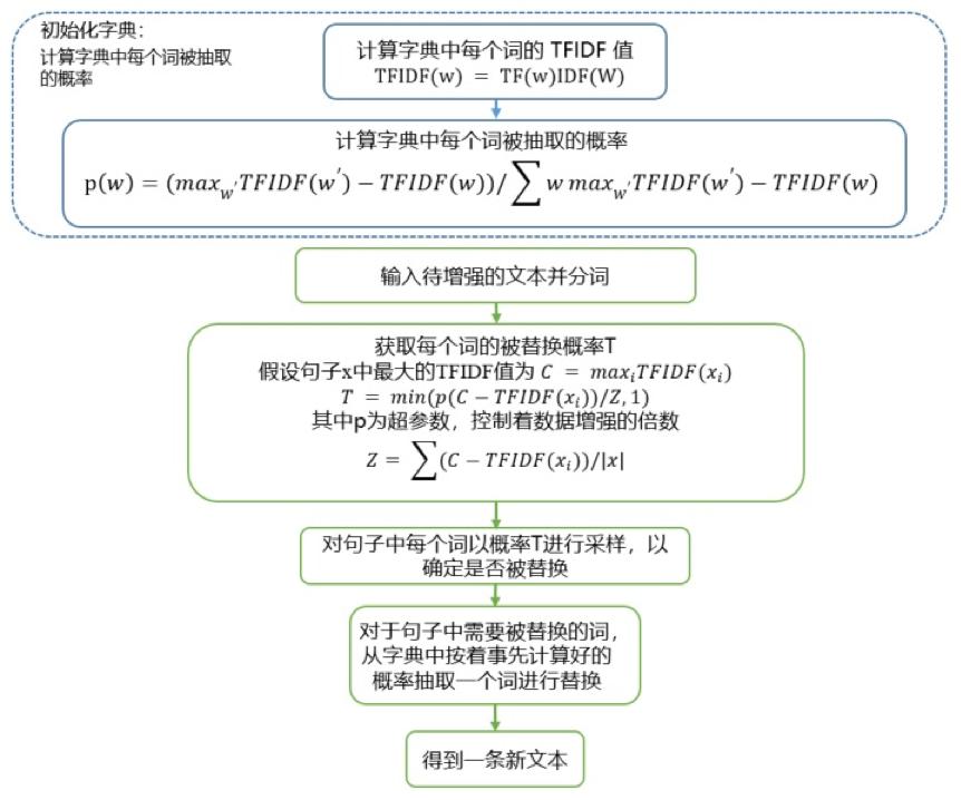 TF-IDF = TF×IDF,通过此公式可以有效衡量一个词对于一段文本的重要性。当我们知道一个词对于一个文本的重要性之后,再采用与 TF-IDF 负相关的概率去采样文中的词,用来决定是否要替换,这样可以有效避免将文本中的一些关键词进行错误替换或删除。