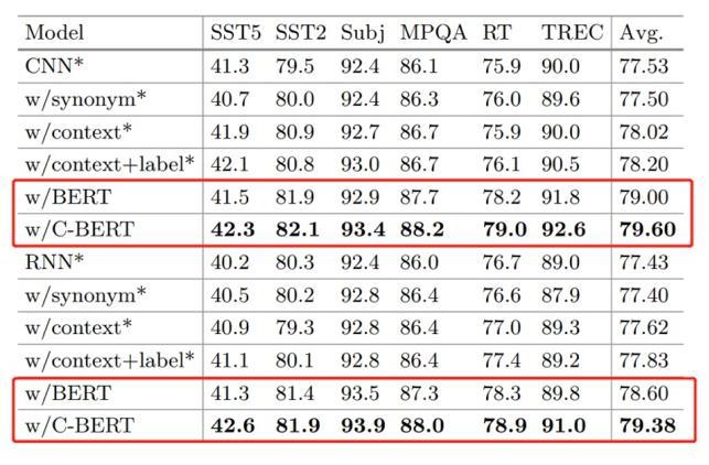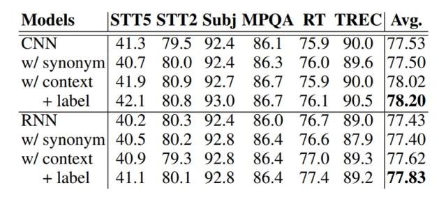 研究人员在五项公开的文本分类数据集中进行实验测试,为了更充分地对比,实验中分别采用了卷积神经网络(CNN)和循环神经网络(RNN)作为分类模型,最终在五项任务中的平均表现如下表所示 [2.2.1]: