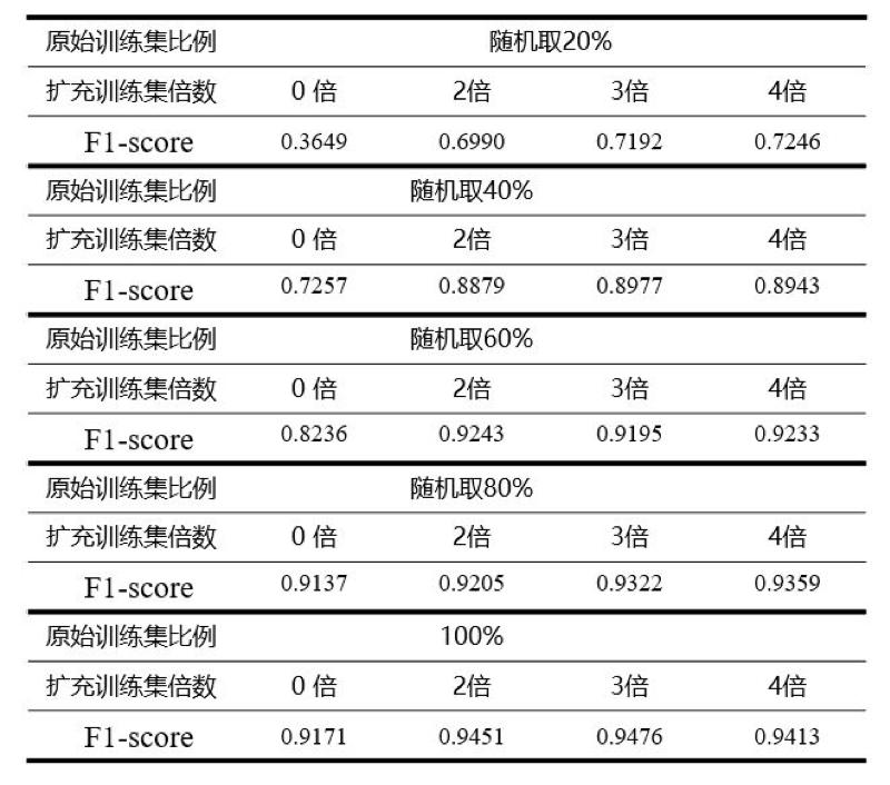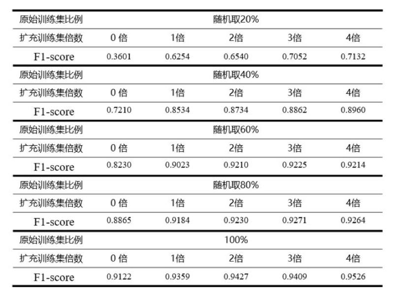 步骤二:从原始训练集的 900 条样本中随机取 20%、40%、60%、80% 和 100 % 比例的数据,然后混合进对应的增强后数据(包括 0 倍,即不做增强),在不同混合倍数下进行模型训练,并记录最优实验结果;