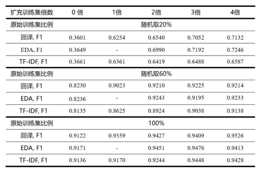 遗憾地是,论文没有对基于 TF-IDF 替换的文本增强技术的效果进行单独研究,或许团队内部实验过,但没有放在论文中。本文的姊妹篇 文本增强技术在金融领域的应用实践,单独对这一技术的效果进行了对照实验,感兴趣的同学可以参考。