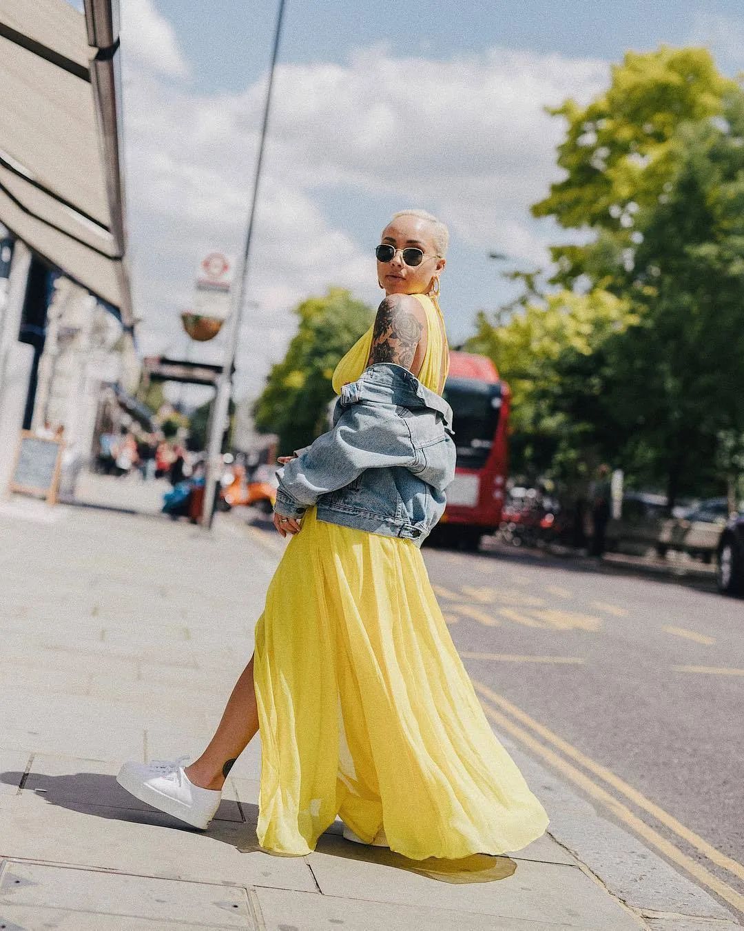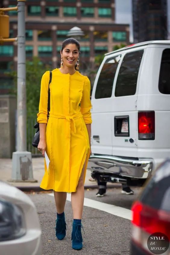 微博上的“淡黄长裙穿搭大赛”,就看到很多中国女孩用了白黄两色的搭配。比如现在这个天气,就很适合用黄色长裙搭配白色针织衫,外面可以再加件风衣或者小外套。而蓝色作为黄色的互补色,又很衬偏黄的皮肤,配在一起会比直接穿黄色和谐很多。黄裙子+蓝色牛仔外套+白色球鞋的搭配,简直让人重回 20 岁。但也不必那么严格,只要全身的大体色调是这两种颜色,再多出 1-2 种比较出挑的色彩也不错。03