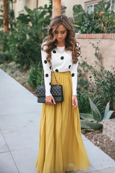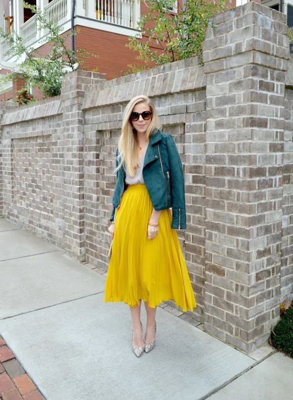 简单来讲就是:1 件深色外套,1 条黄色裙子,1-2 件浅色系单品这样的搭配,看图会比较直白。把深色放在上半身,会无形中让脸看起来气色更好;黄色放在下半身,也不失春季搭配的明媚感。想穿黄色又怕显得脸色不好的姑娘们,强烈推荐你们试试!04