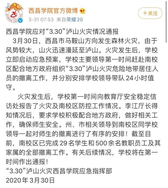 早上7时53分,西昌学院官方微博发布“西昌学院应对‘3.30’泸山火灾情况通报”称,截至目前,南校区已完成29名学生和500余名教职员工及其家属的全部撤离工作。