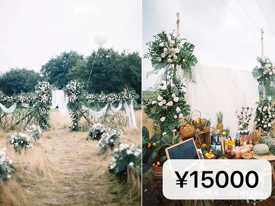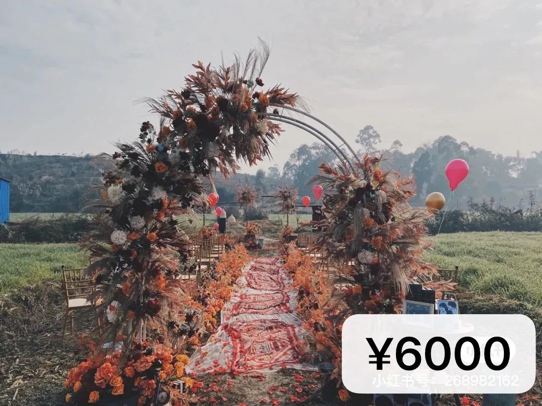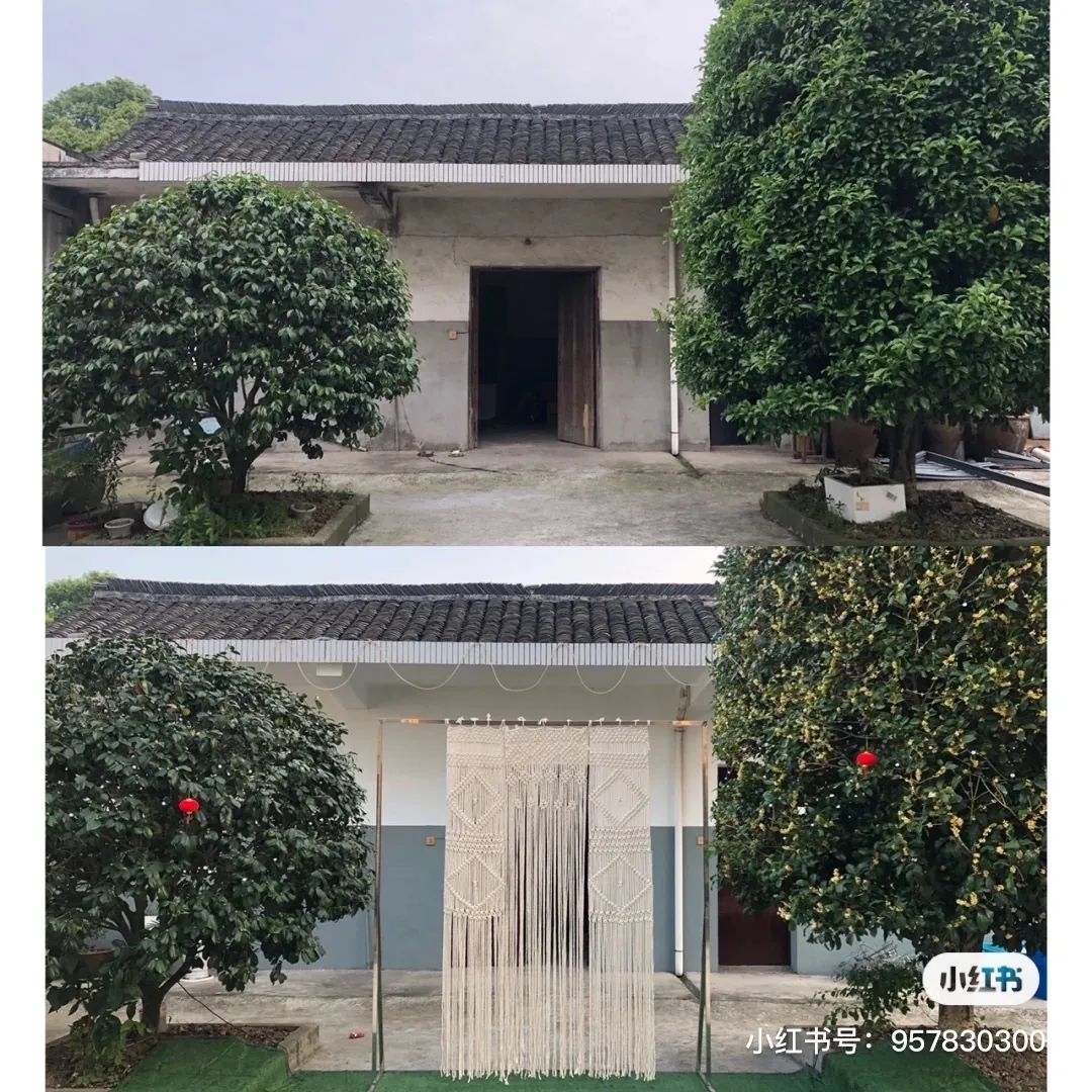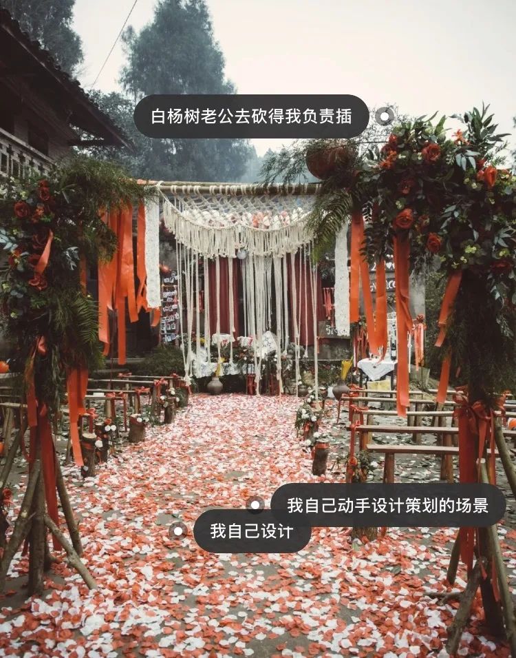 比如自己就是一个专业化妆师的肖肖,她回乡下筹办自己的婚礼,花两千块就搭建了一个这样的效果,老公自己上山砍白杨树,自己设计场景手工制作装饰: